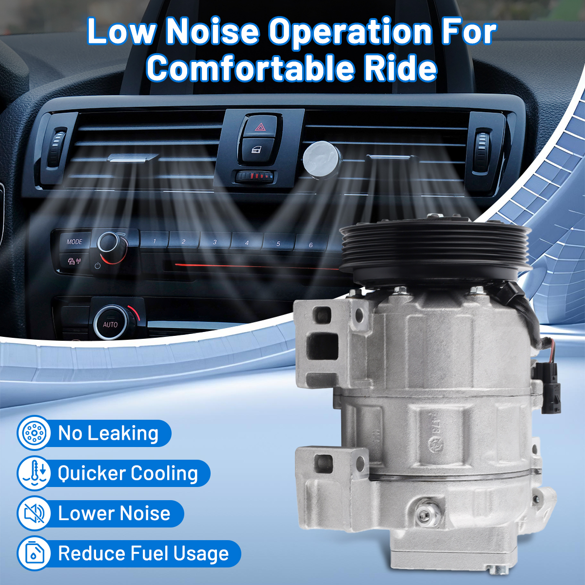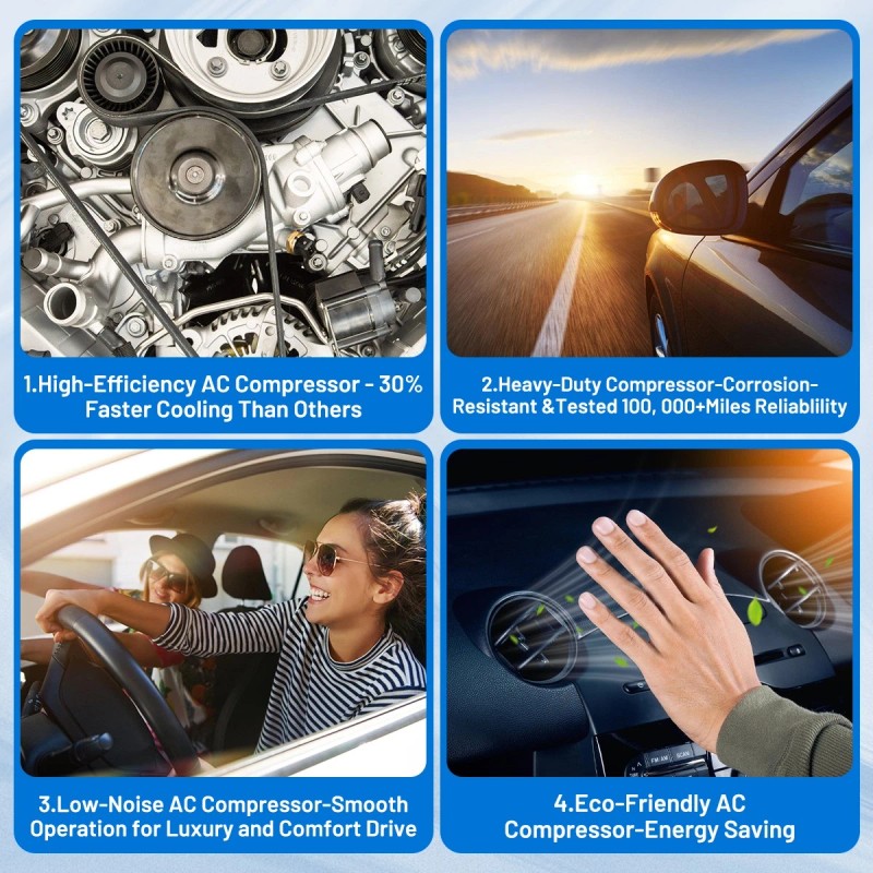 Our  AC compressor kit works efficiently under low noise and tiny vibration  to provide you a super cool trip. Driving at a stable speed will help  reduce fuel consumption.