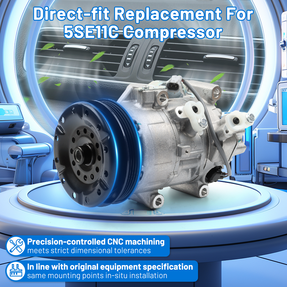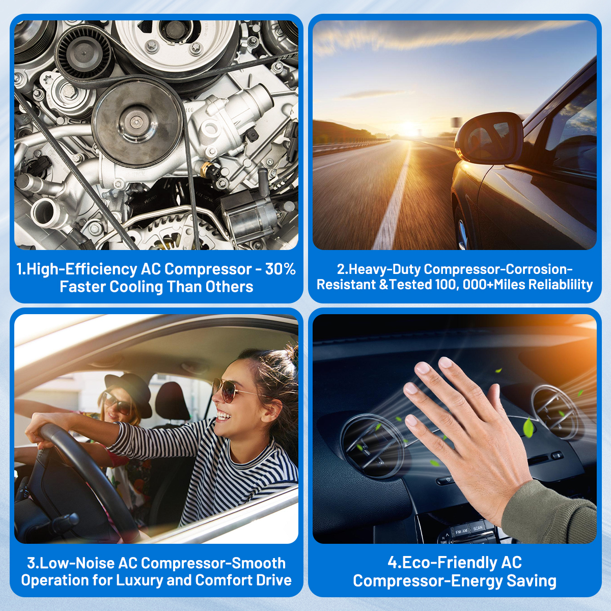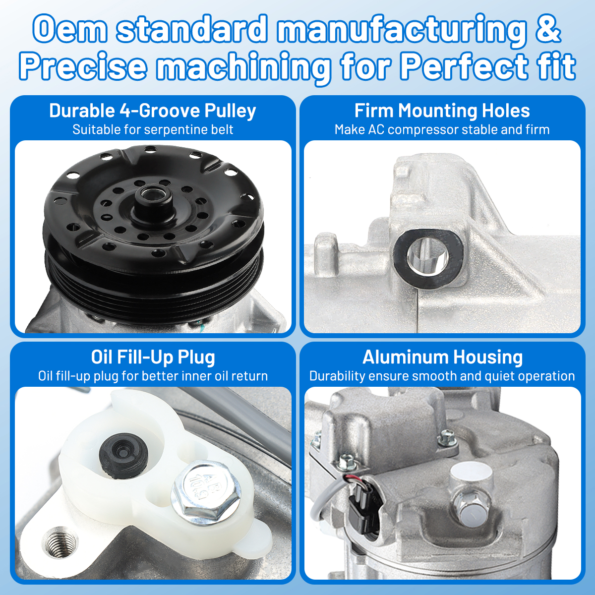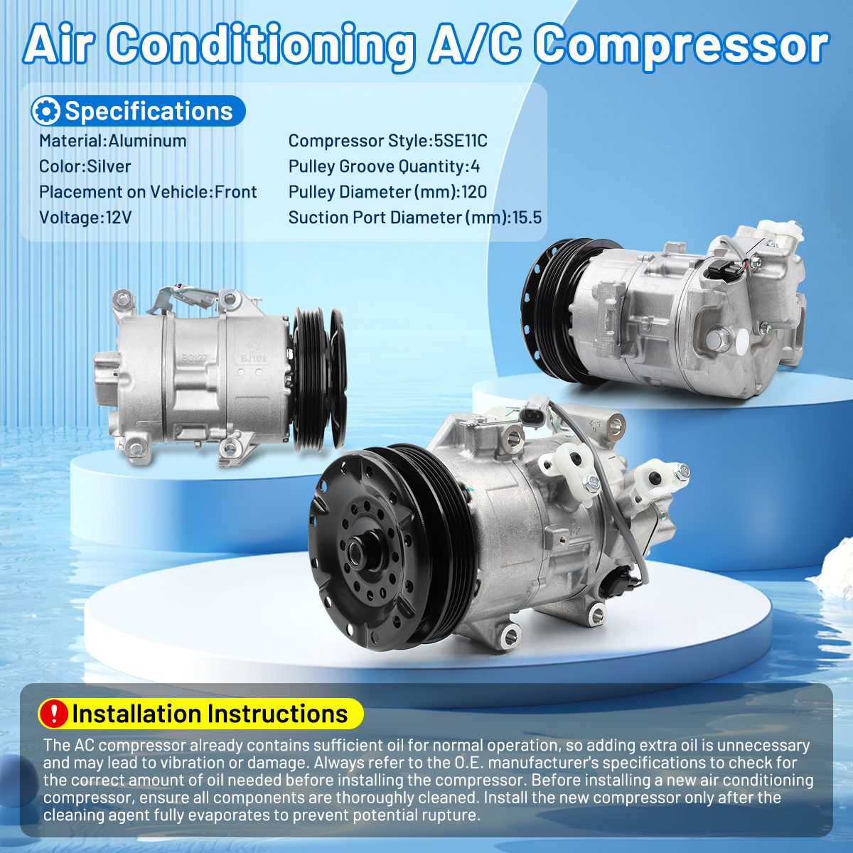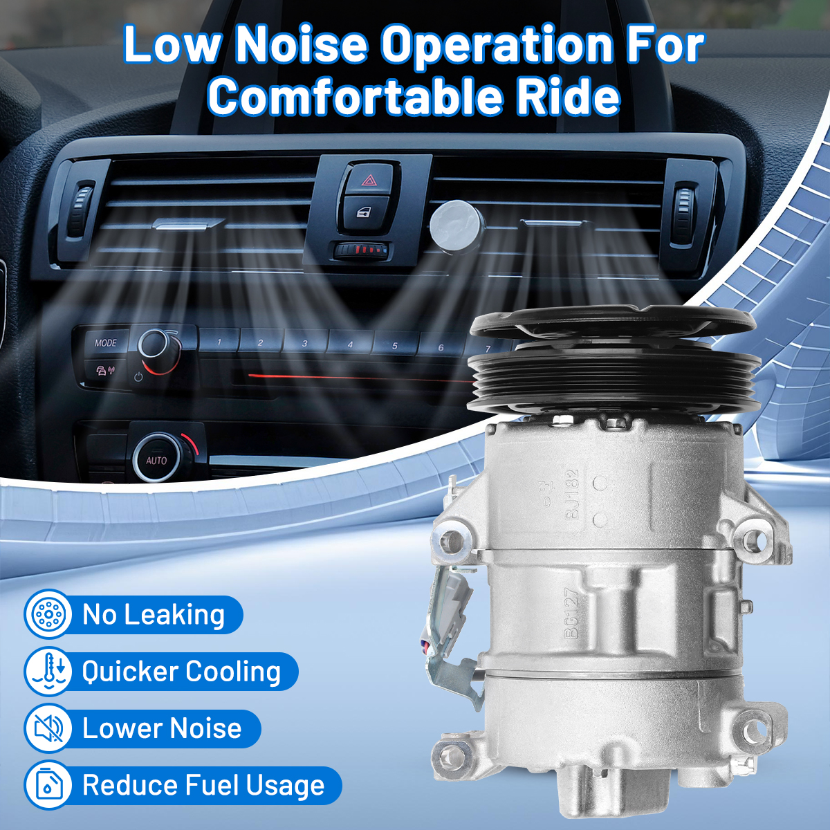 Features: Built to strict quality control standards 100% factory tested. 100% Compatible with OEM Parts, meets Original Equipment Manufacturer (OEM) Standards. This powerful auto AC compressor can provide intense pressure to achieve strong cooling effect, and it also manifests excellent performance in dissipating heat and ventilation.Longer life of the alternator through the use of premium brushes and other critical components that resist failure or poor performance. Our AC compressor kit works efficiently under low noise and tiny vibration to provide you a super cool trip. Driving at a stable speed will help reduce fuel consumption. The compressor is mainly made of high-strength aluminum alloy, therefore, it is not only durable but also ensures stability and a real long service life.