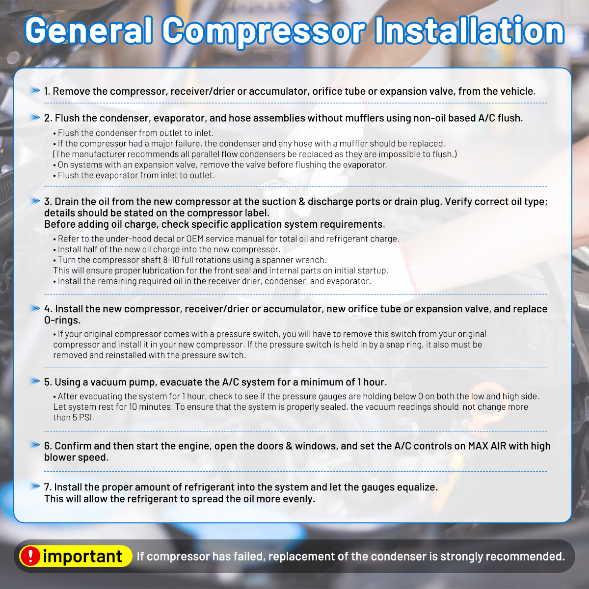 Attention: 1.Remove compressor, receiver drier or accumulator, orifice tube or expansion valve. 2.Flush the condenser and evaporator using NON-OIL BASED A/C flush. On expansion valve systems. The valve must be removed before the evaporator can be flushed. Flushed condensers from outlet to inlet and evaporators from inlet to outlet. 3.Drain all the oil from the new compressor and dispose of according to local, state and federal laws. (NOTE: if your compressor has a drain plug, you will need to open it up and drain what oil is in there too.) 4.Install half oil charge into the compressor and the remainder throughout the system. Turn compressor shaft 8-10 full revolutions to insure front seal and other internal parts are lubricated. 5.Install new receiver drier or accumulator and new orifice tube or expansion valve. 6.Evacuate the A/C system for a minimum of one hour. 7.After evacuation install half the refrigerant charge and let the system set for 1 minute. This will allow the refrigerant to pick up oil and spread more evenly throughout the system. 8.Start engine whit A/C controls on MAX AIR with door and windows open. 9.Add the remaining charge of refrigerant as called for by the manufacture.