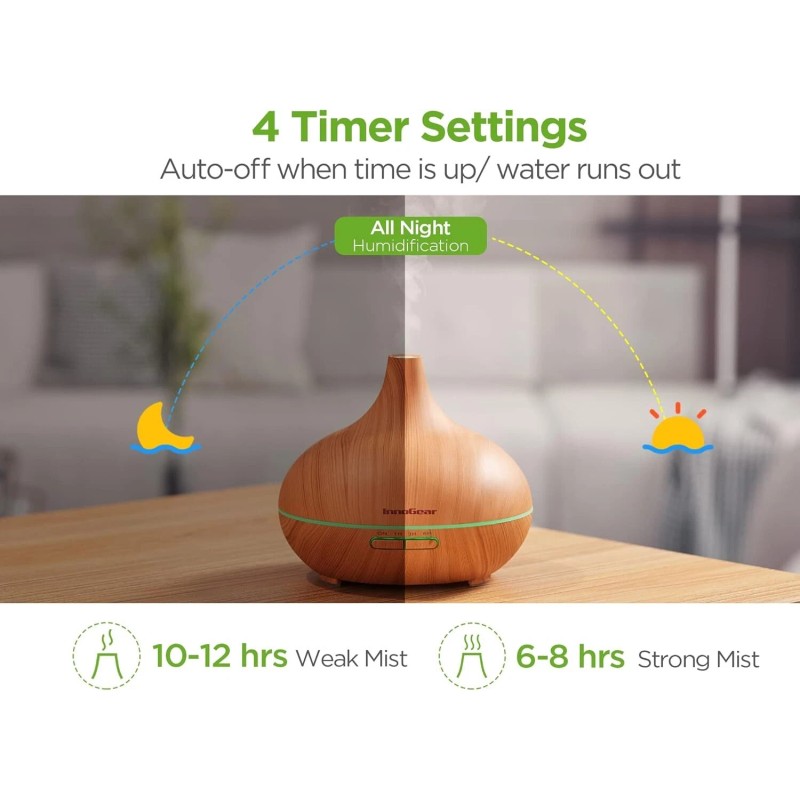 - Optional Runtime & Mist Modes: Choose from 4 timer settings (Continuous Mode/1H/3H/6H) and 2 mist levels (Strong/Weak). The diffuser automatically stops when time is up or when the water runs out, ensuring safety and peace of mind.