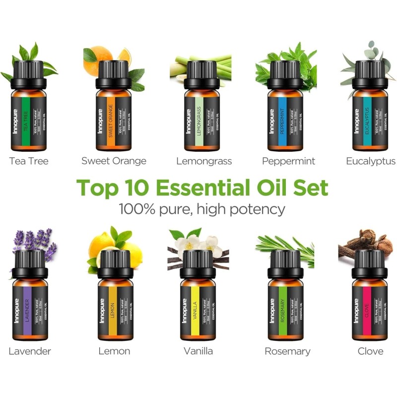 - 10 Essential Oils Included: The set features 10ml bottles of essential oils including peppermint, orange, lavender, tea tree, rosemary, eucalyptus, lemongrass, lemon, clove, and vanilla. These pure, natural scents will rejuvenate your space and enhance your mood.