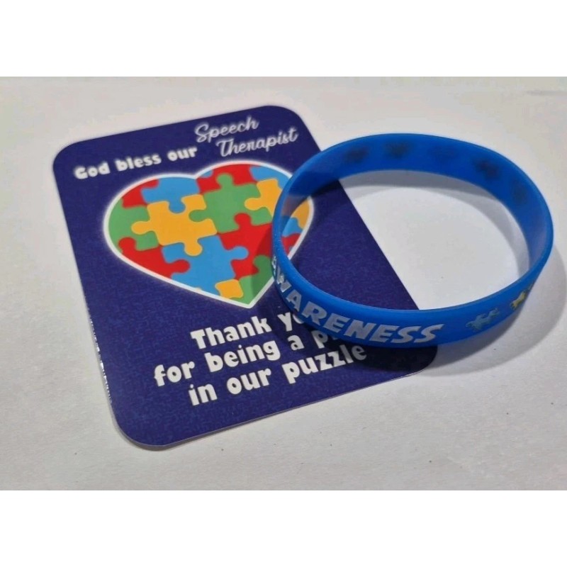 The product is an Autism Speech Therapist pocket card featuring a puzzle heart with hands and the words "God bless our Speech Therapist" and "Thank you for being a piece in our puzzle". The pocket card is 3x4 inches in size rounded corners and are made of photo paper. The Autism Awareness silicone bracelet features mulitcolored puzzle pieces . An acknowledgement and thank you to those who provide care to the autistic community.