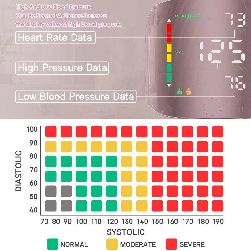 【Upgraded Touch Screen&Color wrist blood pressure monitor】:Our blood pressure monitor wrist is different from other traditional wrist blood pressure monitors, Features larger pink gold-plated LED screen and touch screen buttons and pink cuff, clear readings, and people with impaired vision can quickly view the results. Three-color display LED screen, different blood pressure datas show different colors, you can know whether the blood pressure is in the normal range through the color.