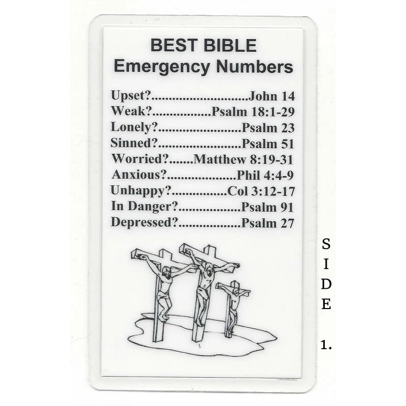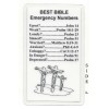 You are purchasing one (1) laminated Best Bible Emergency Numbers card. Card is great as a quick reference. Can be kept in your wallet, purse, pocket or as a book mark.