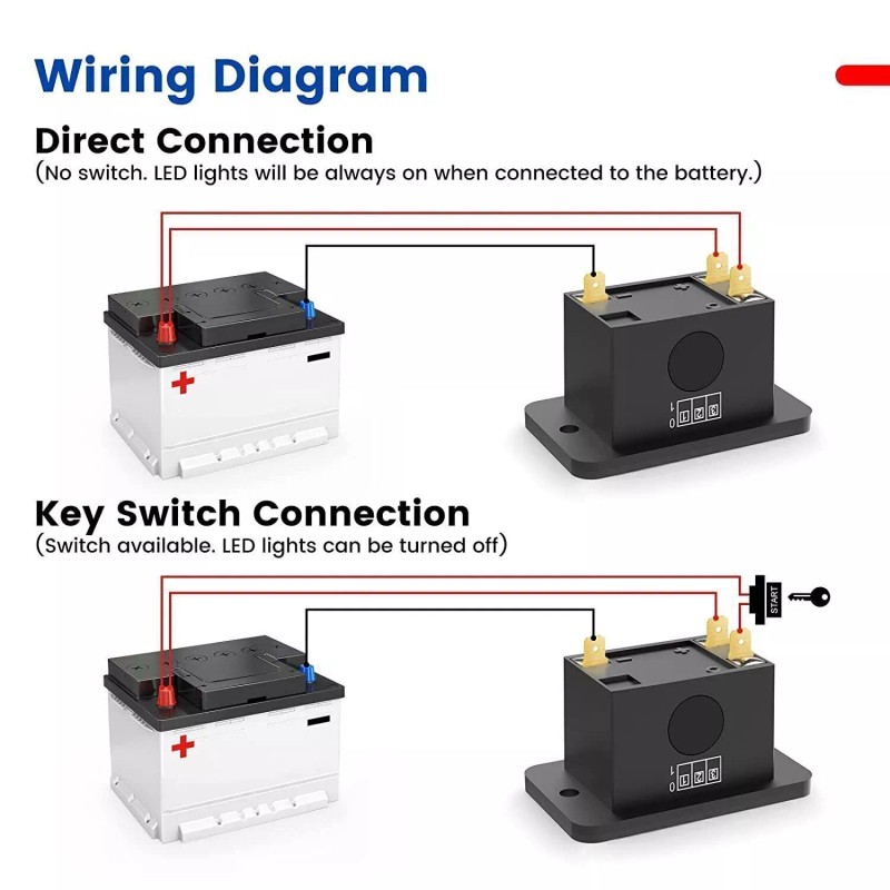 You can drill an accurate panel cut-out size 2.09*1.26*1.18 inch proper place of equipment for installation; 2 power connection diagrams to be chosen: direct & key switch.