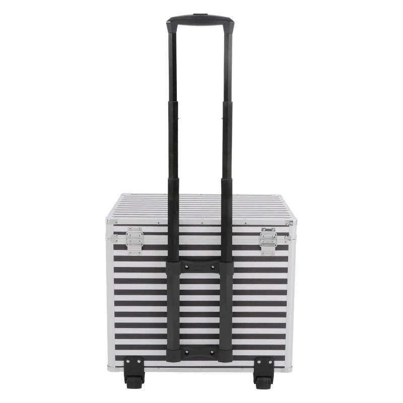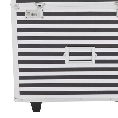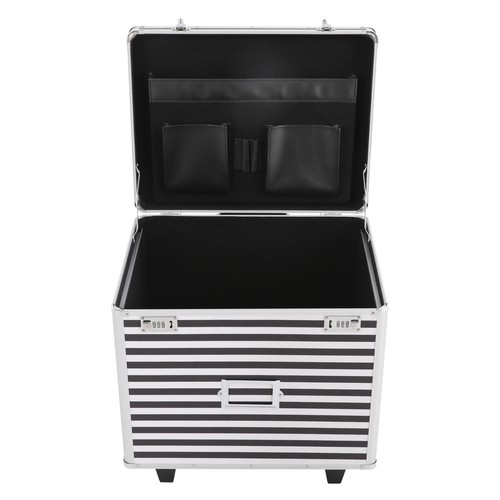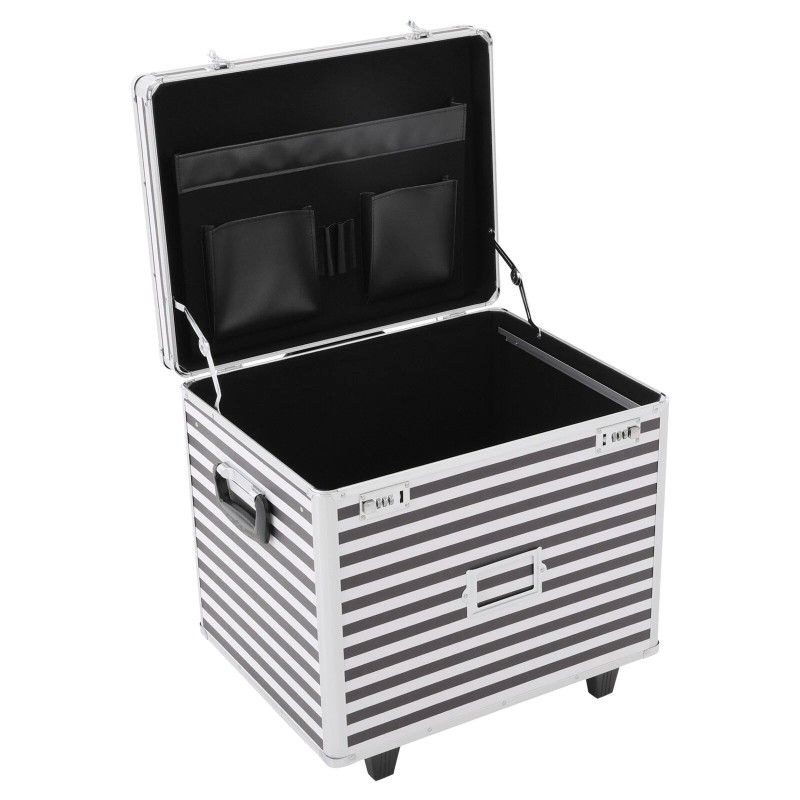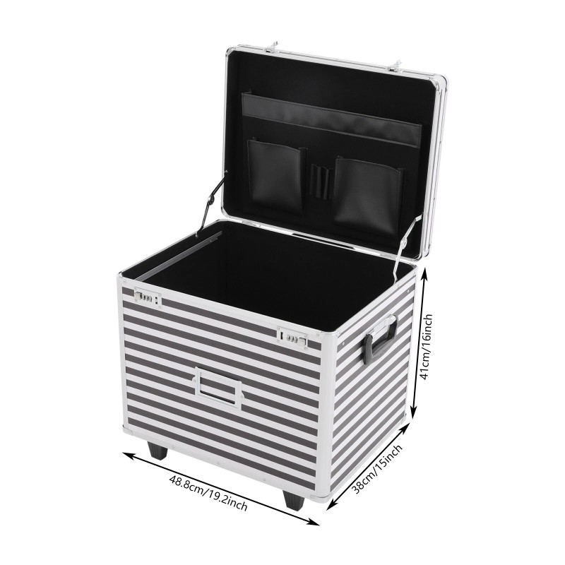 This rolling file storage case is made of sturdy aluminum alloy with a striped finish for a stylish and durable look. The large capacity of the case and the pocket inside the lid make it easy to store documents and small items, the wheels and telescopic pole make it easy to move around, and the combination lock keeps the contents safe. With it, you can safely store some important documents without worrying about losing them.