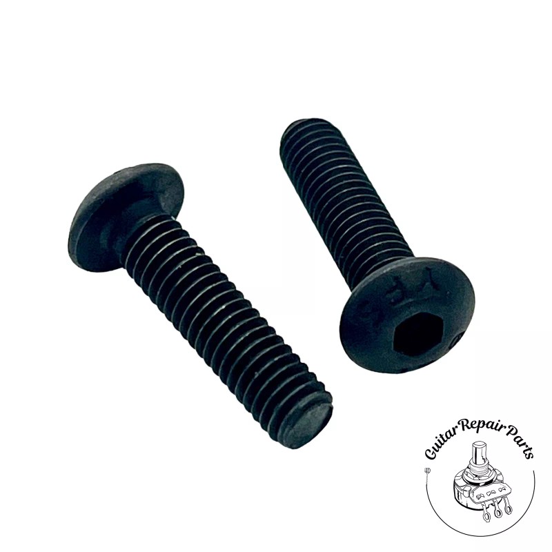 These screws are used to fasten a locking nut to the instrument through the back of the neck. This style of mounting has been featured on locking tremolo designs from brands like Floyd Rose, Ibanez, and Gotoh. In most cases, the neck is drilled on either side of the truss rod and the screw would be countersunk allowing for a discrete mount.