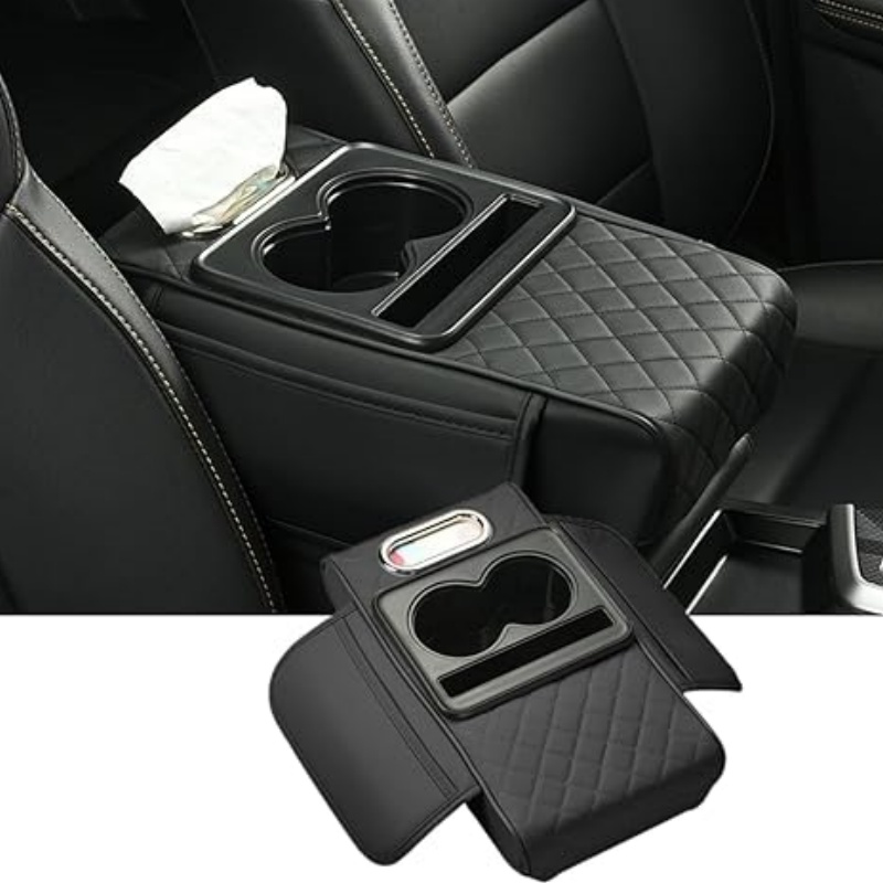 Unbranded Car Center Console Cover PU Leather Armrest Cover with Cup Holder and Tissue Box