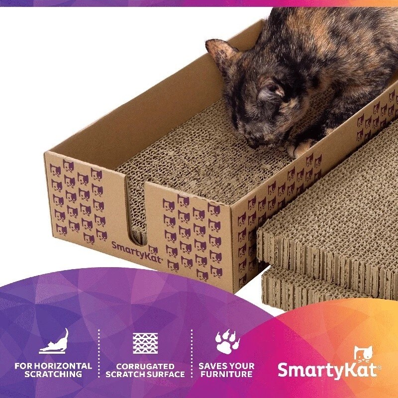 SmartyKat Super Scratcher Stacker Box comes with three reversible scratch pads. When one side is worn, simply flip it over for a new scratch surface; when both sides are worn, move on to the next scratch pad. You can stack the scratch pads for a scratch and lounge area or use one or two at a time for a scratch cuddler. The high walled tray also helps to contain scratch debris, keeping it off the floor.