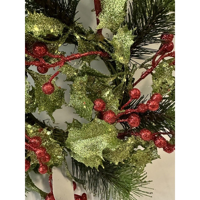 Unbranded Christmas Candle Ring Wreath Plastic Holly Berries Glitter 10 1/2” Round