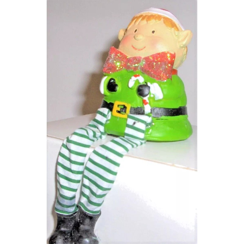 Liven up your home with This whimsical character. This delightful character is wearing a green outfit with a Santa hat, and a large glitter bow tie. The elf is holding a candy cane. Its legs are green & White cloth stripes.