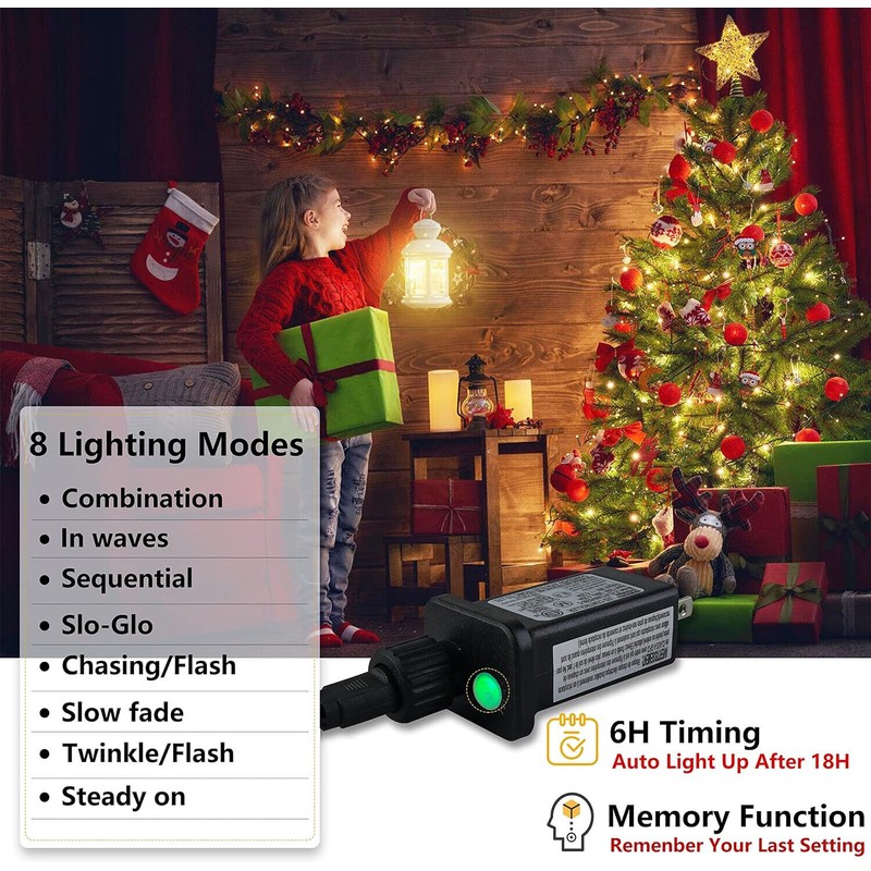 - 8 LIGHTING MODES & MEMORY FUNCTION LED CHRISTMAS LIGHTS : Our Christmas lights with 8 different lighting modes(Combination, In Waves, Sequential, SLO-GLO, Chasing/Flash, Slow Fade, Twinkle/Flash, and Steady on). The memory function is designed to remember the last setting after cutting off the power.