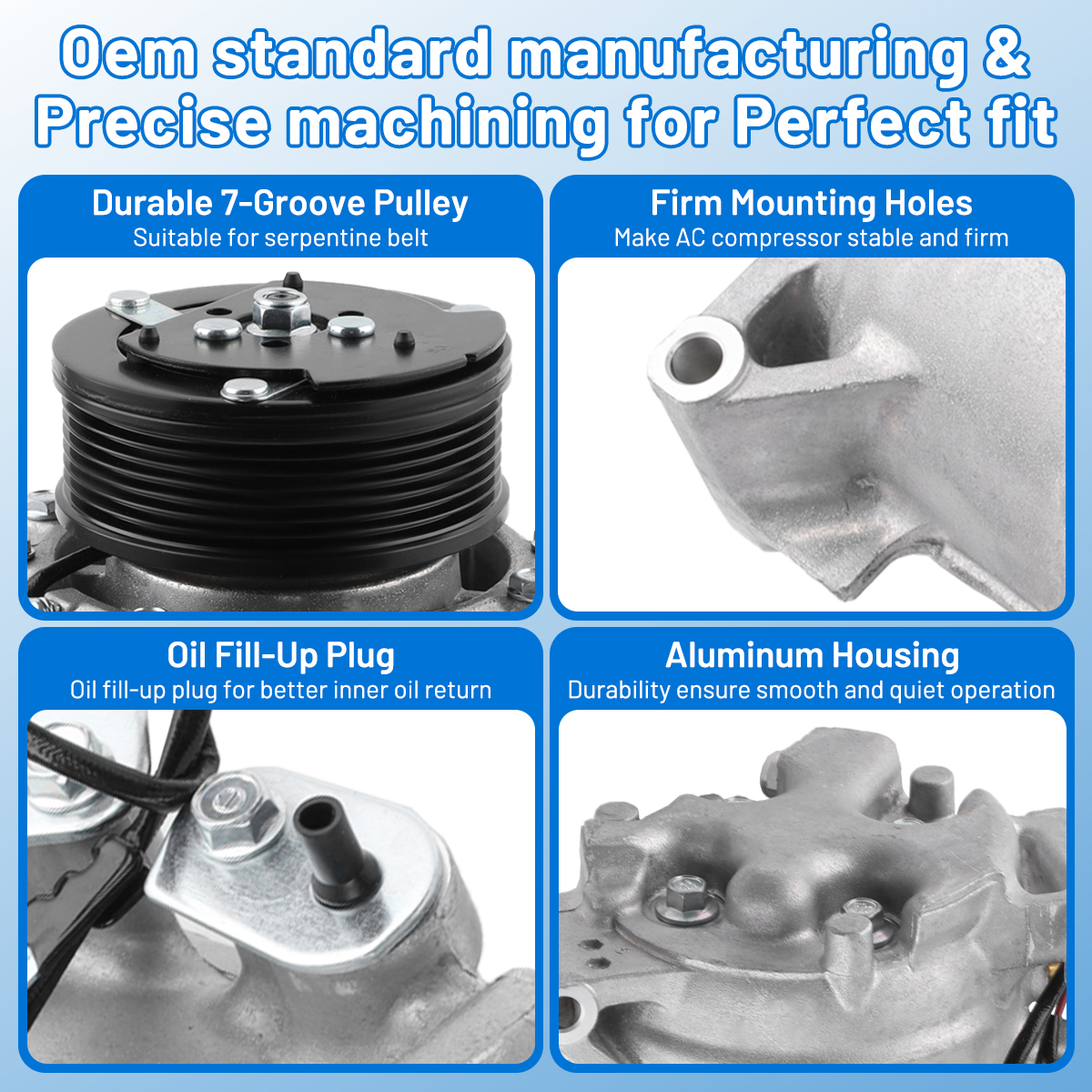 This powerful auto AC compressor can provide intense pressure to achieve strong cooling effect, and it also manifests excellent performance in dissipating heat and ventilation.Longer life of the alternator through the use of premium brushes and other critical components that resist failure or poor performance.