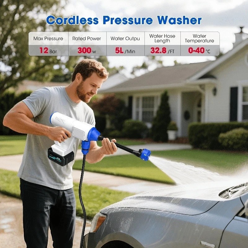 Powerful Cordless Pressure Washer - pressure washer comes with a 300W brushless motor, the maximum pressure is 12bar with water output 5L/Min.  This cordless power washer is a versatile tool designed for washing and removing stains from various surfaces, including cars, concrete patios, decking, and more.