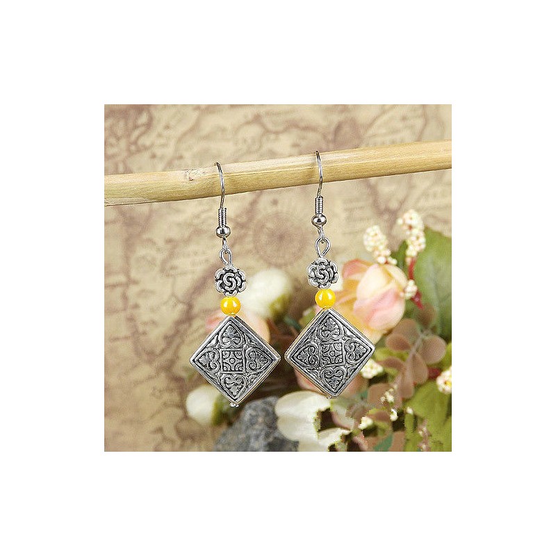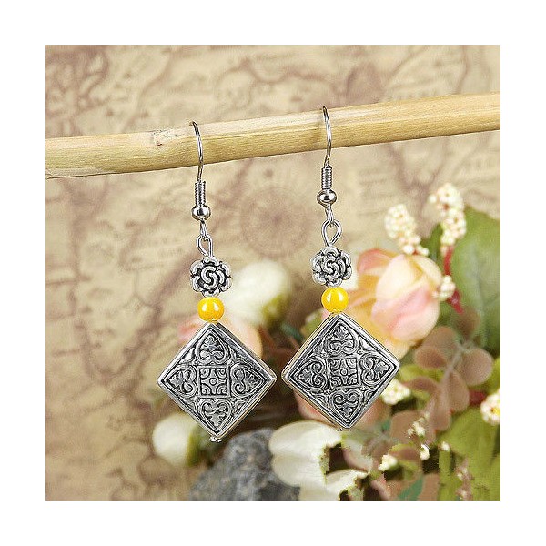 Cute New Tibetan Silver Carved Diamond Shape Bead & Resin Yellow Bead Charm Dangle Drop Earrings