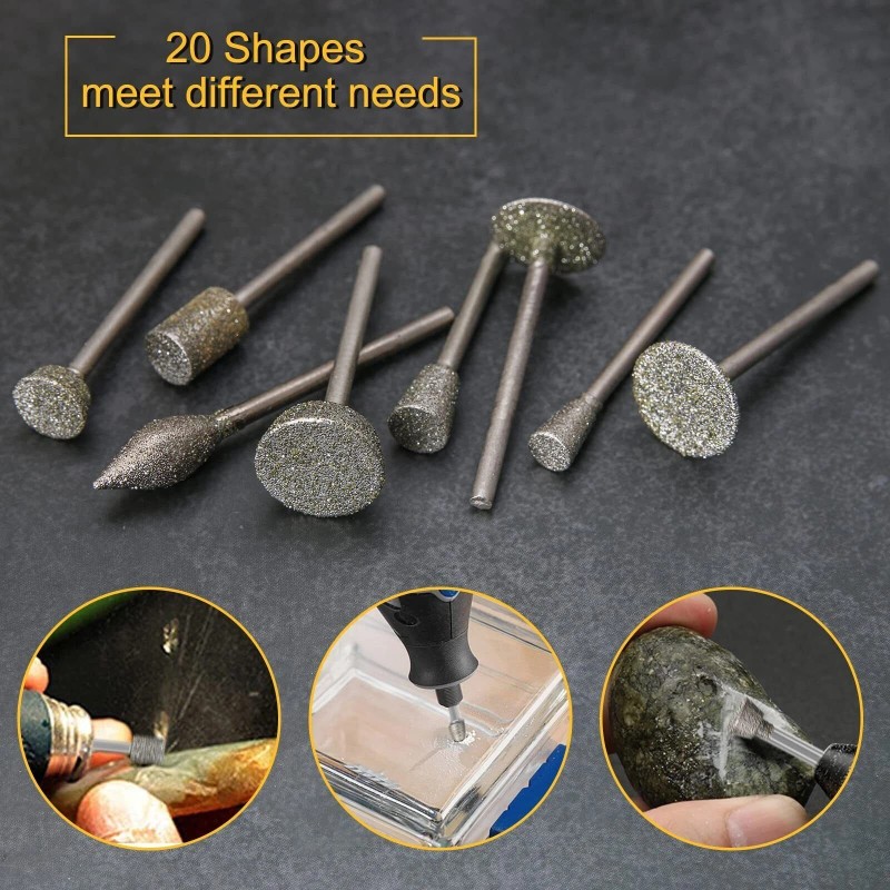 - √【Set Inclueds】20 Diamond Bur Bits,10 Diamond Cutting Wheels ,2 Mandrels.