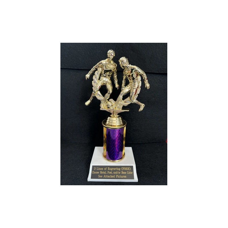 Double Action Wreath Soccer Male trophy with 3” post. Includes FREE ENGRAVING, up to 3 lines.