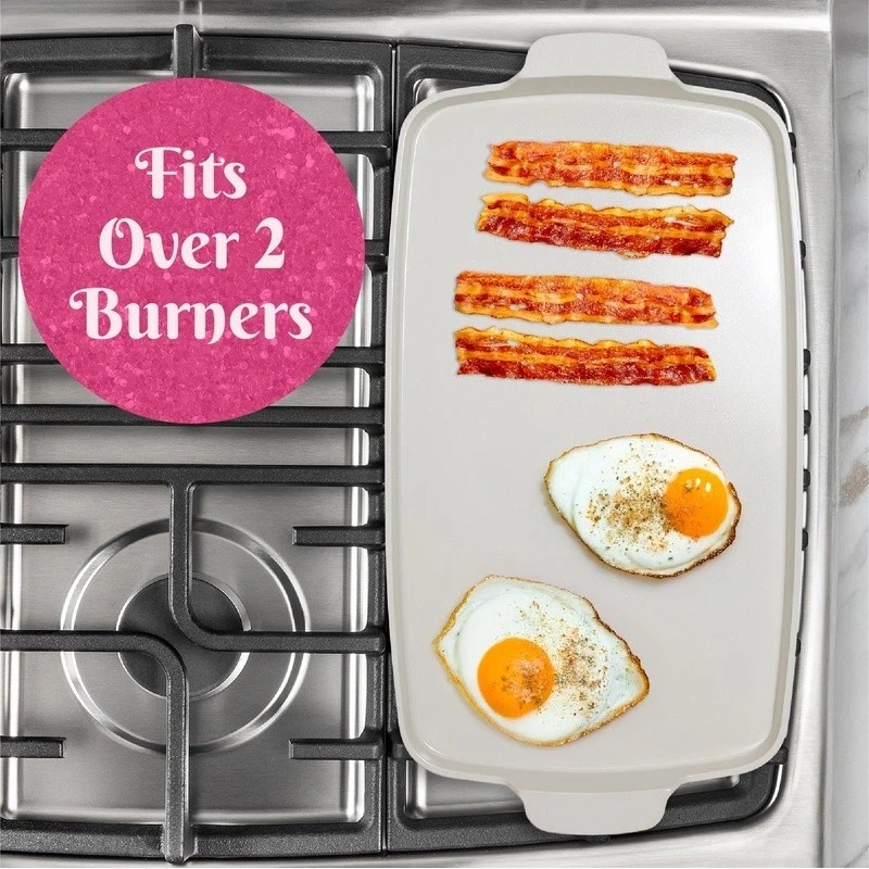 Take your cooking game to iconic new heights with the  Double Burner Griddle, crafted for chic, high-performance cooking.  This 17. 8"" x 10. 5"" griddle features a soft pink finish, heavy gauge cast aluminum body, and Clean Ceramic™ nonstick coating, combining style, durability, and effortless performance.  Designed to span two burners, it provides fast and even heating across the entire surface, making it perfect for pancakes, eggs, burgers, veggies, and more.  The Clean Ceramic™ coating delivers easy food release and fast cleanup—just what every sliving chef needs.  It’s oven safe up to 400°F for up to 30 minutes, allowing for versatile cooking, and is also dishwasher safe for quick, easy cleanup.  Suitable for gas, electric, and glass stovetops (not for induction).  Always use over two burners for optimal results and even heating.  Whether you’re hosting brunch, prepping for a backyard BBQ, or making a family breakfast, the  Double Burner Griddle makes every meal stylish, easy, and totally iconic.  Don’t forget to share your kitchen moments with #BeAnIcon for a chance to be featured on Paris' social media!