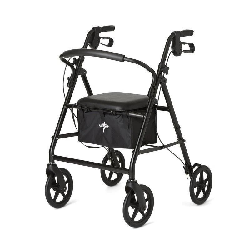 DURABLE STEEL FRAME ROLLATOR —Supports a weight capacity up to 300 lbs. , making it safe and comfortable for the user and their belongings EASY-TO-USE BRAKE HANDLES—Ergonomic handles are easy for seniors and fragile hands to grip without being slippery; push up to brake and push down to lock wheels in place; adjustable height hand from 31-35" PADDED SEAT AND BACKREST—Rest in comfort with 12X12" padded seat and backrest; comes with convenient storage under the seat FOLDABLE FRAME—19 lb. frame is designed to fold down for easy transport and storage ROLLS SMOOTHLY INSIDE OR OUT—Easily walk inside and outside with large, stable 8" wheels designed for smooth transportation on any terrain