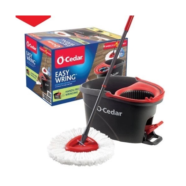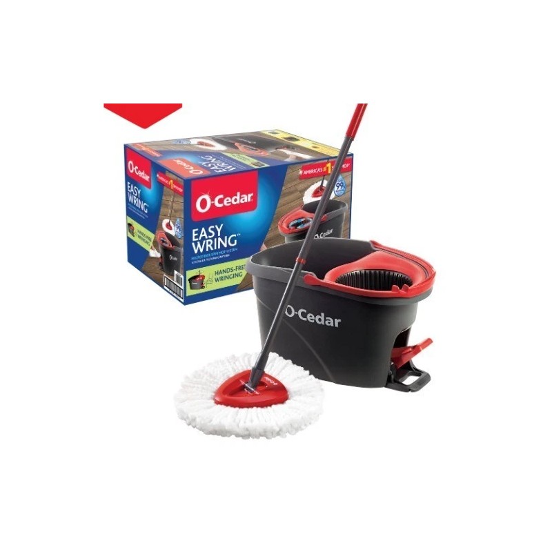 America’s #1 spin mop* is trusted for a reason. The O-Cedar EasyWring™ Spin Mop & Bucket System was the original hands-free spin mop—and it's still the easiest way to deep clean your floors without bending or getting your hands wet. With its built-in foot pedal wringer, reusable microfiber mop head, and adjustable handle, this all-in-one system is designed to make mopping simple, effective, and mess-free. The included microfiber mop head removes over 99% of bacteria with just water**, and it's completely machine washable—toss it in the wash to reuse again and again. The triangular mop head easily reaches into corners and under furniture, while the adjustable handle helps reduce back strain during deep cleans or everyday touch-ups.