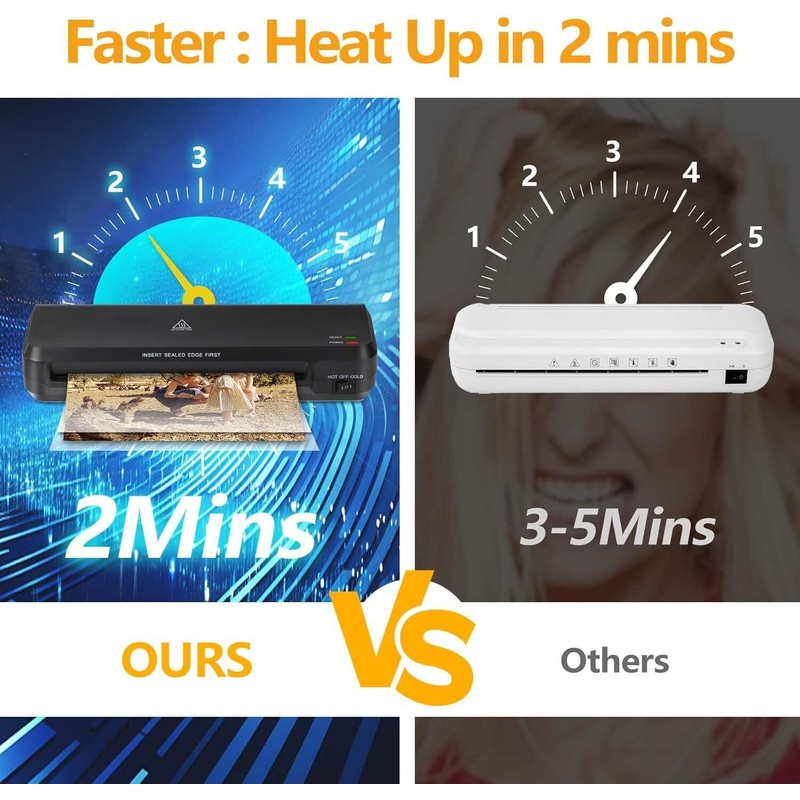 The machine heats up in just 3-5 minutes, saving you time and allowing you to start laminating quickly. Its auto-shutoff feature ensures energy efficiency and safety by turning off after 15 minutes of inactivity.