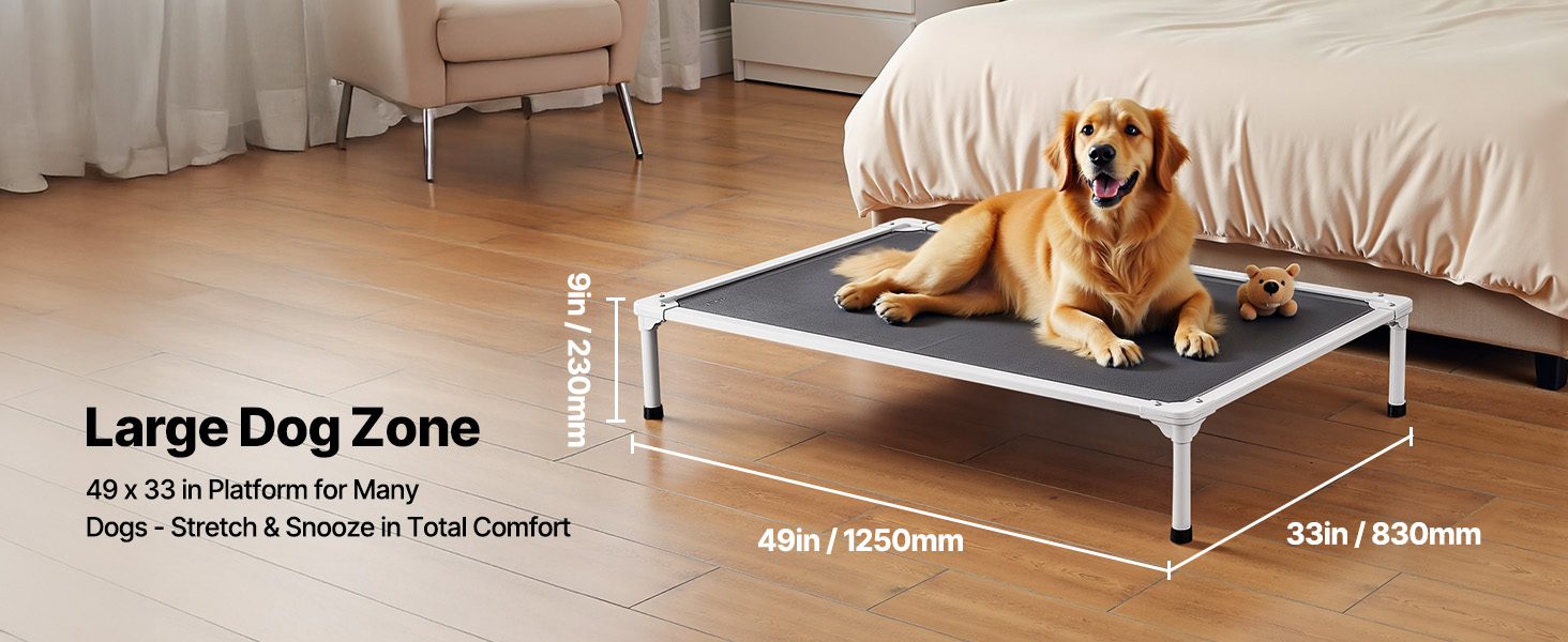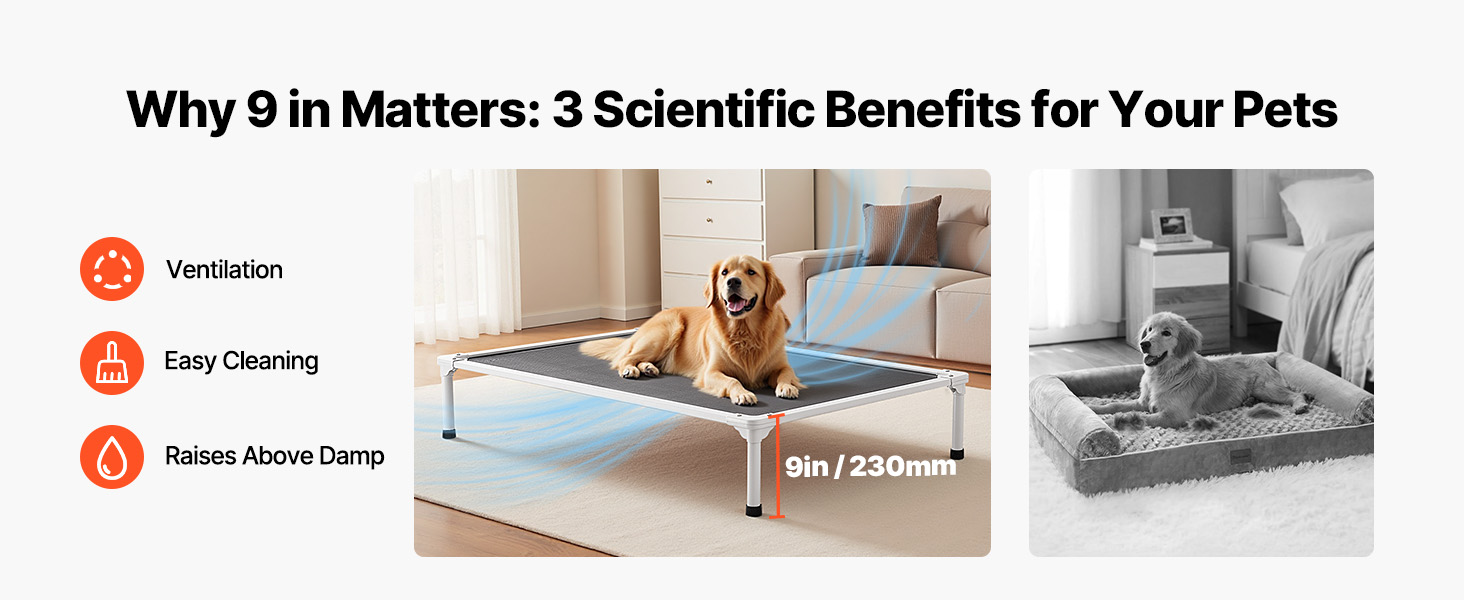 - Tool-Free Quick Assembly: Comes with clear assembly instructions, allowing you to set it up in just 10 minutes. New pet owners can easily assemble it too. The 9 in / 230 mm elevated height keeps your pet off the ground, isolating them from moisture, dust, and cold temperatures. It provides cooling airflow in the summer and can be paired with a blanket in winter for warmth