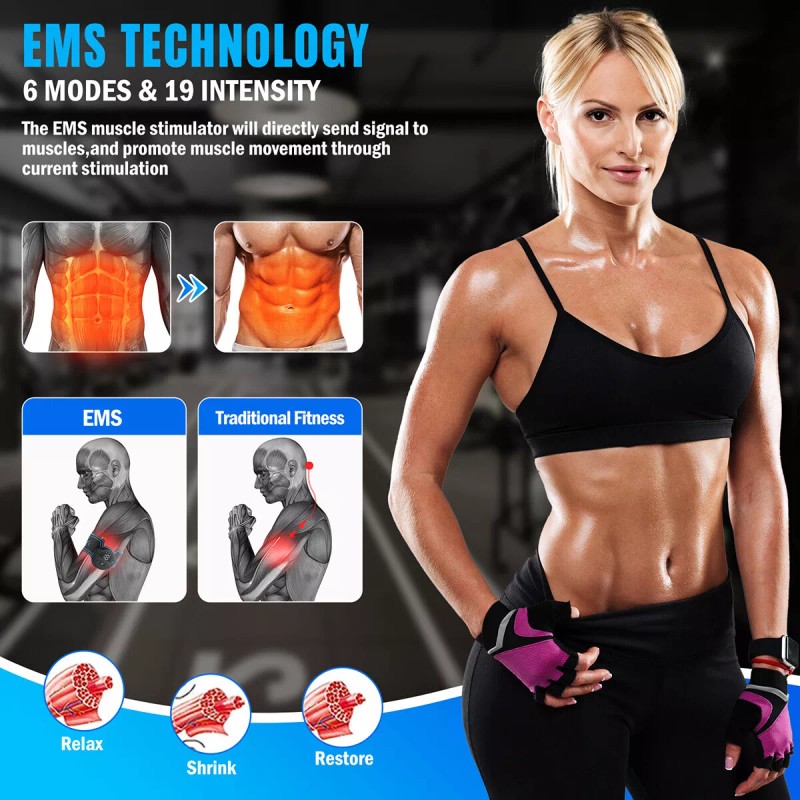 -- EMS Technology: The abdominal muscle patch uses EMS technology to stimulate your muscles through powerful electrical pulses, automatically tightening and toning your abdominal muscles, easily burning fat, strengthening muscles, and shaping your body anytime, anywhere.