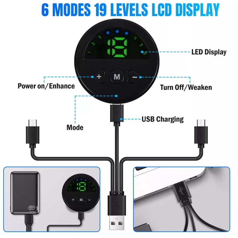 -- LCD Display: The controller is equipped with an LCD display, which can display the intensity level and working mode, and is equipped with a USB charging cable, which can be powered by a computer or a mobile power supply.