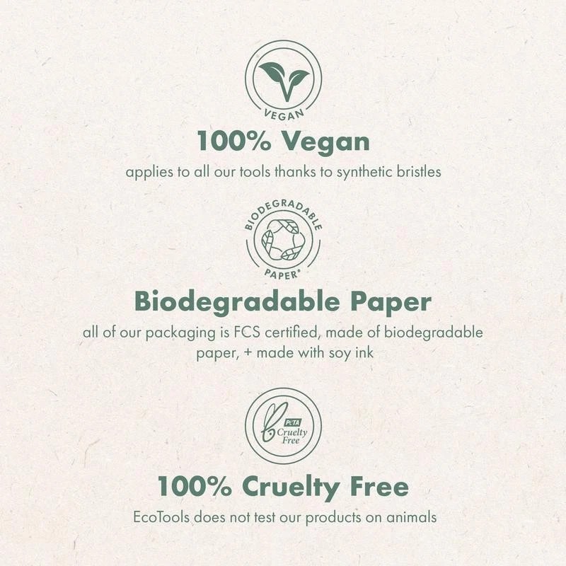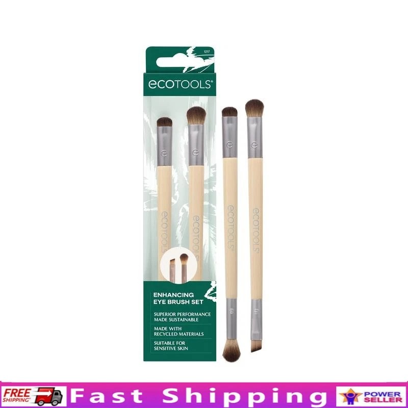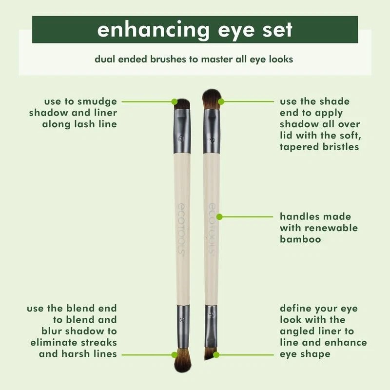 The EcoTools Enhancing Eye Makeup Brush Set is best for an enhanced eye look Includes: (1) Shade + Define Eye Brush Duo and (1) Smudge + Blend Eye Brush Duo Eye brushes best used with liquids, creams, powders, and stick eyeshadows and liners Apply and shape product with the Shade + Define Brush and blend and blur shadow with the Smudge + Blend Brush Dual-sided makeup brushes are great for taking on-the-go when traveling Suitable for sensitive skin EcoTools makeup brushes feature 100% renewable bamboo handles and aluminum ferrules Makeup brush made with sustainable, soft, synthetic hair Eco-Friendly, FSC®-certified compostable paper packaging* Always 100% vegan and PETA cruelty-free- EcoTools products are never tested on animals