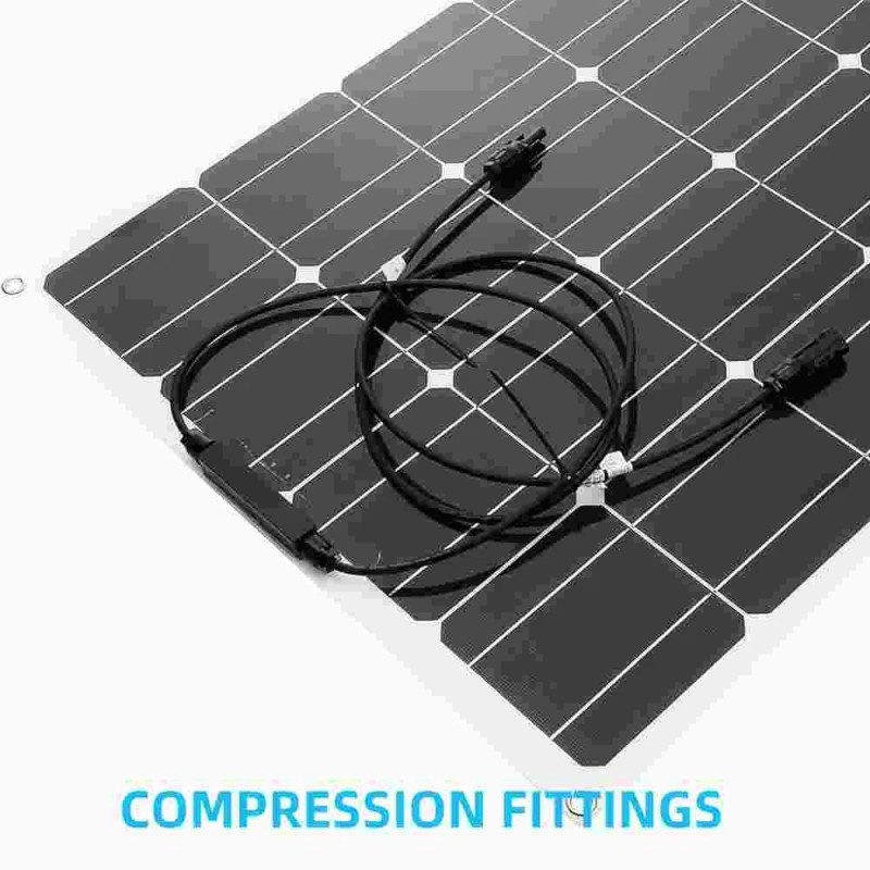 Owing to its 0.1inch thickness,this 100w flexible solar panel boasts a unique frameless design.You can be fixed onto the desired surface by glue, tape, grommet, or Velcro.This design ensures easy installation.Six metal-reinforced mounting holes for fixing screws,hanging and removing the panel while allowing easy transportation.