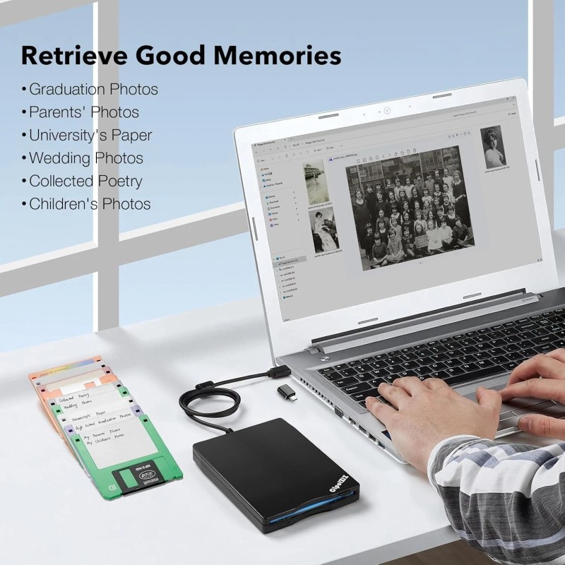 - Portable External Floppy Drive : With ultra-slim (Only 0.63 inch thick) design and lightweight(Only 0.52 Ib), you can easily carry and use this compact USB floppy disk reader to retrieve your photos, favorite poetry, university graduation thesis, novel manuscript and favorite songsinside your floppy disks at anywhere. It's a great gift idea for someone who have a lot of memories in the floppy disks.