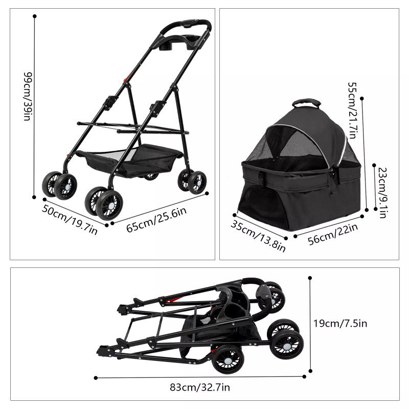 Specifications Material: Carbon Steel, Oxford Cloth    Color: Black Style: Modern Assembly Required: Yes Target Species: Small and Medium-sized Dogs and Cats Number of Wheels: 4(2 Back Wheels with Brakes) Load-bearing Capacity: 20kg/44.09lbs   Carrying Basket Size: 56*35*23cm/22*13.8*9.1in Awning Height: 55cm/21.7in Folded Product Size(L*H): 83*19cm/32.7*7.5in Unfolded Product Size: 65*50*99cm/25.6*19.7*39in Gross Weight: 5.9kg/13lbs Net Weight: 5.2kg/11.46lbs Package Size: 77.5*41.5*17.5cm/30.51*16.34*6.89in   Package Included 1* Foldable Pet Cart 1* Carrying Basket 1* English Manual All Accessories for Assembly
