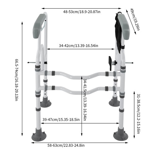 Adjustable Design: The height of the armrest can be adjusted within 26.5-29.1 inches to suit people of different heights. You can also adjust the length of the product (22.8-24.8 inches) to accommodate different sizes of toilets.