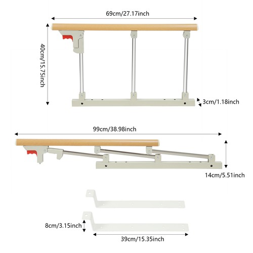 Specification  Color: Wood+White Style: Modern Material: Stainless Steel, PVC, Aluminum Alloy Process: Baking Paint Overall Max. Load-Bearing Capacity: 100kg/220.46lbs Each Base Size(L*H): 39*8cm/15.35*3.15in Folded Product Size: 99*3*14cm/38.98*1.18*5.51in Product Size: 69*3*40cm/27.17*1.18*15.75in Package Size: 102*15*5cm/40.16*5.91*1.97in Gross Weight: 3.5kg/7.72lbs Net Weight: 2.9kg/6.39lbs Package Included 1 * Foldable Bed Safety Rail 1 * Screwdriver 1 * Wrench Other Accessories for Installation