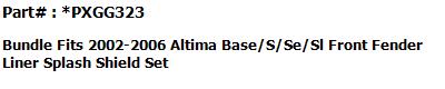 This is a Brand New replacement parts for For 02-06 ALTIMA BASE/S/SE/SL MODEL FRONT FENDER LINER LH. | |||