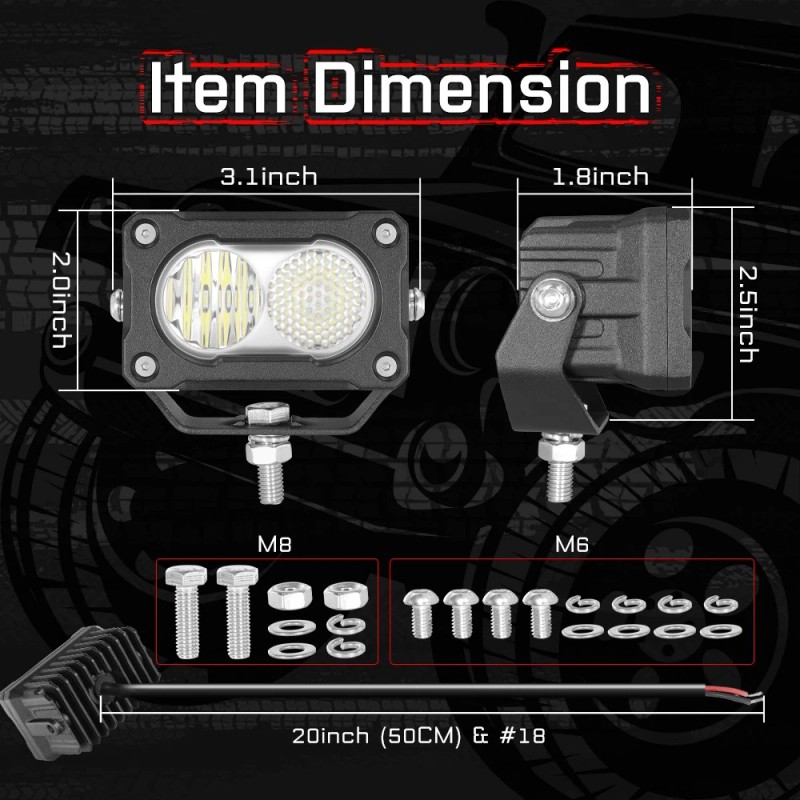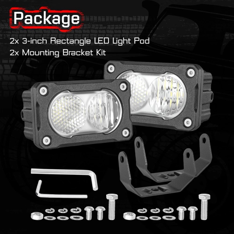 Item Feature: Roof Rack Side LED Lighting, Angled for Precise Lighting,Mounts to Most Roof Racks, pretty decent lights for backup reverse, running light, auxiliary lamp, parking light, garden light and more.