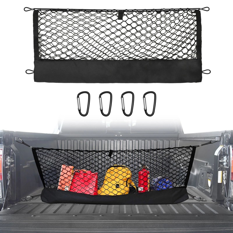 Double layer car rear cargo grocery net makes it possible for double increase in storage space, everything will fit snugly and be held in place in a tight net that expands and contract.
