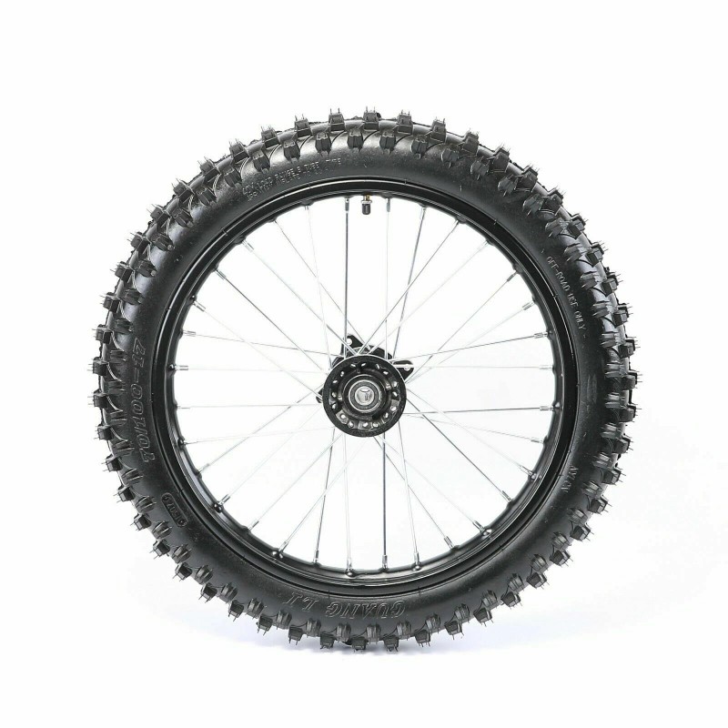 This is a 17" front dirt bike wheel assembly comes with rim, tire, inner tube, wheel bearing.