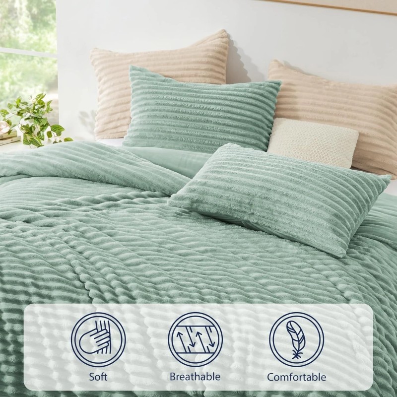 EXQ Home Fluffy Comforter Set Queen Size Super Soft Faux Fur Stripe Jacquard Comforter 3 Pieces, Sage Green Fleece Bedding Set,Winter Warm Bed Set,1 Comforter with 2 Pillowcases