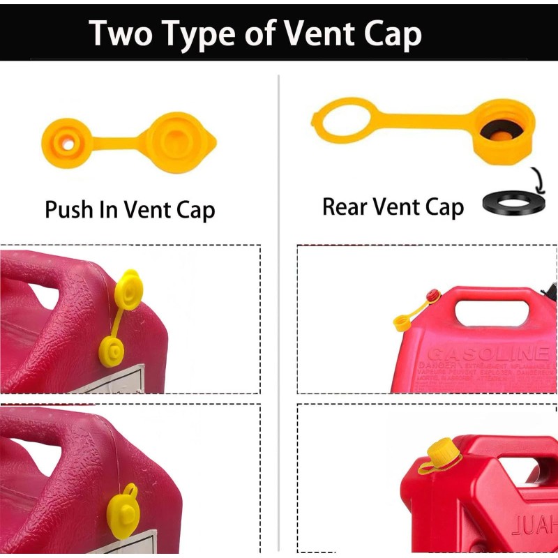 2 vent cap for faster and safer emptying, Push - in vent cap(drill required) for some gas cans WITHOUT vent hole like scepter Midwest, rear vent cap for some gas cans with vent hole like Gott Blitz, Rubbermaid