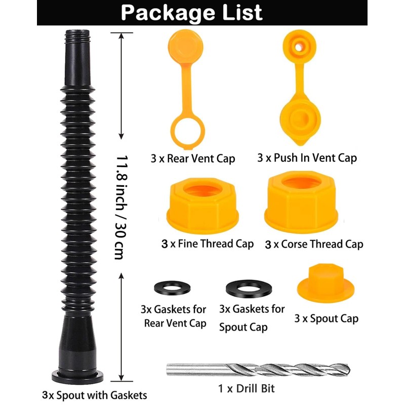 Update your old cans with Complete spout kit includes: (3) gas can filler nozzle, (3) spout cap, (3) "O" ring gasket, (6) base caps, (3) push-in vent cap,(3)rear vent cap,(1) drill bit