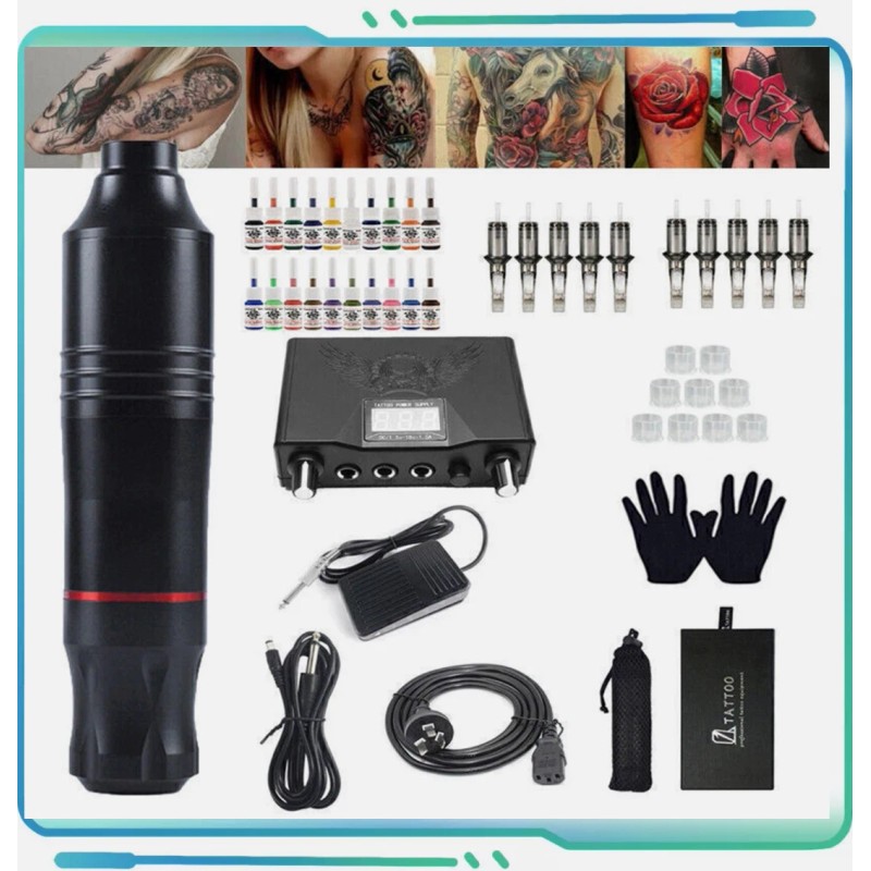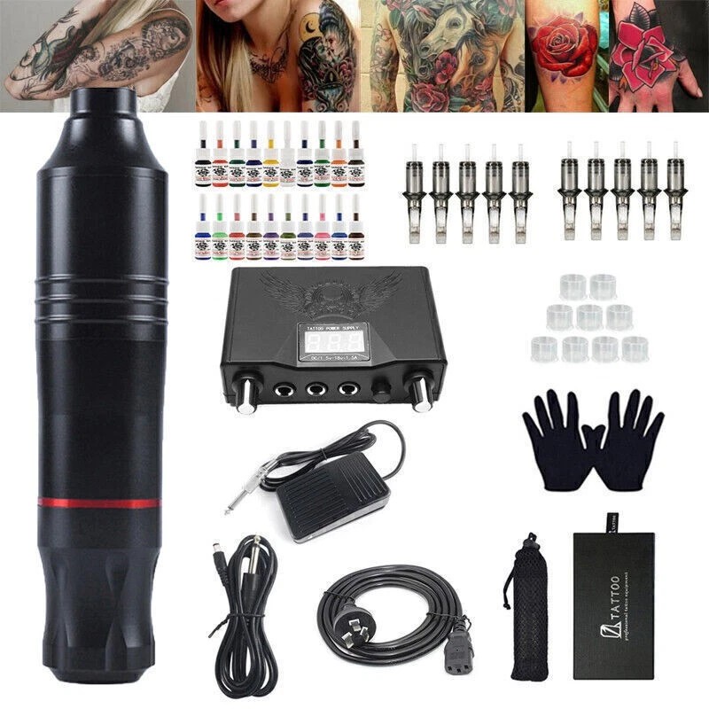 A complete set of tattoo machine supplies, great for tattoo beginners.