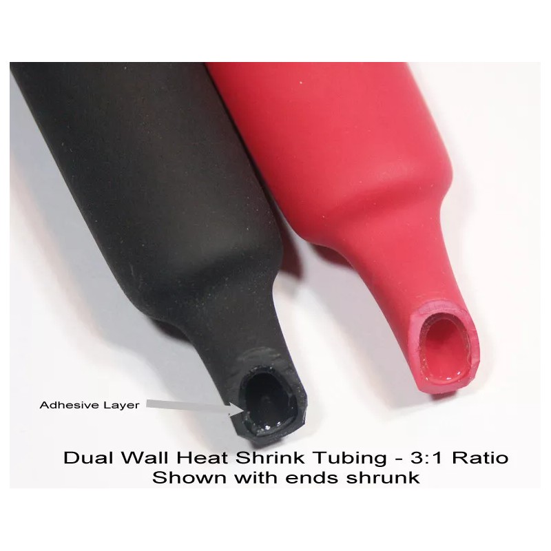 Our DW1S3X dual wall adhesive lined Polyolefin 3:1 ratio heat shrink shrink tubing provides environmental sealing for a wide variety of applications. Inner hot melt adhesive lining melts around the cabling or connectors and conforms to the shape of the connection to seal out the environmental elements as the tubing shrinks. The additional benefits of dual wall adhesive heat shrink tubing are that it also provides a stiffer covering compared to standard heat shrink which lends it self well to providing additional strain relief for connector to cable transitions and it can also be used to hold cables to a specific shapes. When using dual wall heat shrink tubing you want to consider the irregularities of the shape you are trying to seal. If you use a larger diameter tubing rather than a closely sized shrink tube you will get more adhesive to fill in the irregularities of the object to be sealed. The adhesive properties of of the adhesive lining are very similar to the characteristics of common hot melt glue and adheres to metals, plastics, rubbers and fabrics but keep in mind porous objects will have stronger adhesion. In some cases scuffing smooth objects will improve the adhesive properties of the adhesive lining of the heat shrink tubing.