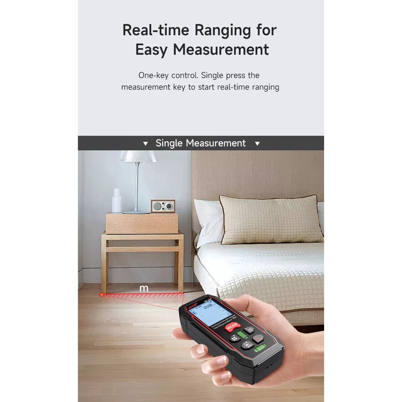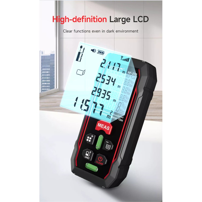 【LCD Backlight and Silent Setting】NF270 digital measuring instrument with 2.0-inch high-definition display allows you to read the display easily in dark areas, and the silent setting allows you to turn on or off the measuring beep at will, suitable for use in quiet places such as libraries, rooms, apartments, classrooms, etc. The level is very suitable for large areas such as homes, real , factories, warehouse buildings, etc.
