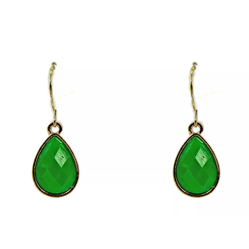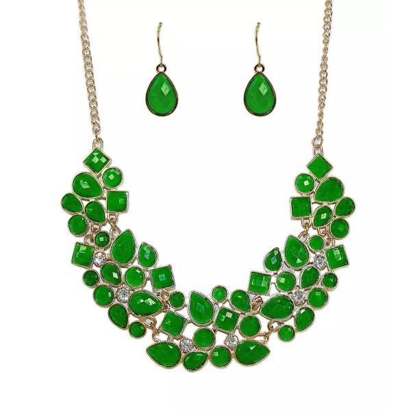Large green statement necklace and earring set created with round and teardrop shape acrylic beads and mixed with round clear crystals.  Each green bead if facet cut and set into gold plated settings.  Perfect for everyday, special events, or weddings.  NEW and never worn.