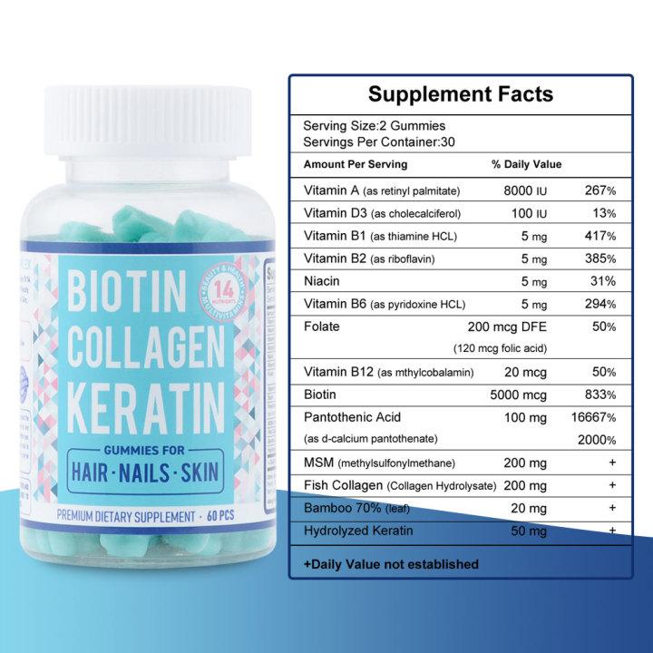 - Premium Nutritional Support: Our multivitamin gummies are packed with essential nutrients like biotin, vitamins, collagen, and keratin. This powerful combination supports thicker hair, stronger nails, and flexible joints while promoting youthful, elastic skin.- Youthful Radiance: Harness the anti-aging of collagen! Our collagen peptide gummies enhance skin elasticity, reduce the appearance of wrinkles, boost hydration levels, and encourage collagen regeneration for a vibrant, youthful.- Encourages Hair Growth: Infused with 5000 mcg of biotin and abundant B vitamins, our gummies nourish hair follicles from within, helping to strengthen existing hair and stimulate new growth for healthier locks.- Supports Strong Nails and Joints: Rich in keratin, our formula promotes robust nails and helps maintain healthy joints. Keratin is essential for fortifying hard tissues like nails, ensuring strength and resilience.- Easy Daily: For optimal results, take 2 gummies daily with a meal. Chew thoroughly before swallowing to maximize nutrient absorption and enjoy a tasty way to support your!