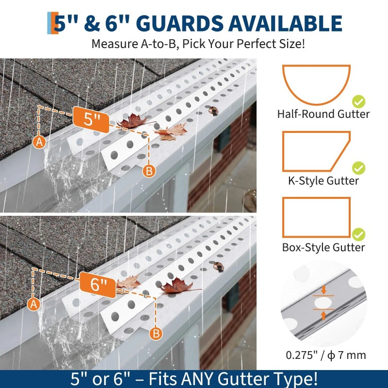 【Specifications】This gutter guards 5 inch width | Total length: 200 Feet | Size of each piece: 5" x 36.22" | Total pieces: 67 PCS | 36.22" x 67 PCS = 200 Feet