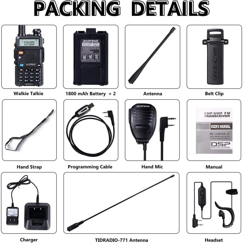 Band Type: Dual Band | Features: LCD Screen,Dual-band display,Dual Freq. Display,Dual Watch,VOX,Busy Channel Lock-Out,Scan,Monitor,Voice Prompt,Built-in LED Flashlight,Emergency Alarm,Long Range,Keypad Lock,Dust Proof | Compatible Model: Universal,For baofeng bf-f8hp,For baofeng uv-82 series | Supported Modes: UHF/VHF |