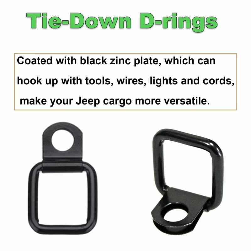 - SUPERIOR QUALITY:Thumb screws are made of durable nylon Hurricane styled head with galvonized steel stud. Tie-Down D-rings are coated with black zinc plate, which can hook up with tools, wires, lights and cords, make your Jeep cargo more versatile.