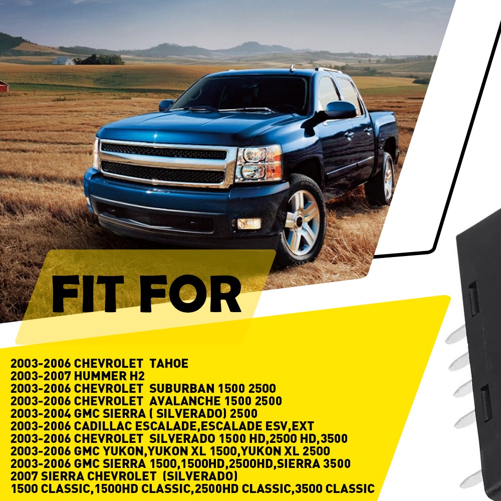 Fits for: 2003-2006 Chevrolet Tahoe 2003-2007 Hummer H2 2003-2006 Chevrolet Suburban 1500 2500 2003-2006 Chevrolet Avalanche 1500 2500 2003-2004 GMC Sierra ( Silverado) 2500 2003-2006 Cadillac Escalade,Escalade ESV,EXT 2003-2006 Chevrolet Silverado 1500 HD,2500 HD,3500 2003-2006 GMC Yukon,Yukon XL 1500,Yukon XL 2500 2003-2006 GMC Sierra 1500,1500HD,2500HD,Sierra 3500 2007 Sierra Chevrolet (Silverado) 1500 Classic,1500HD Classic,2500HD Classic,3500 Classic